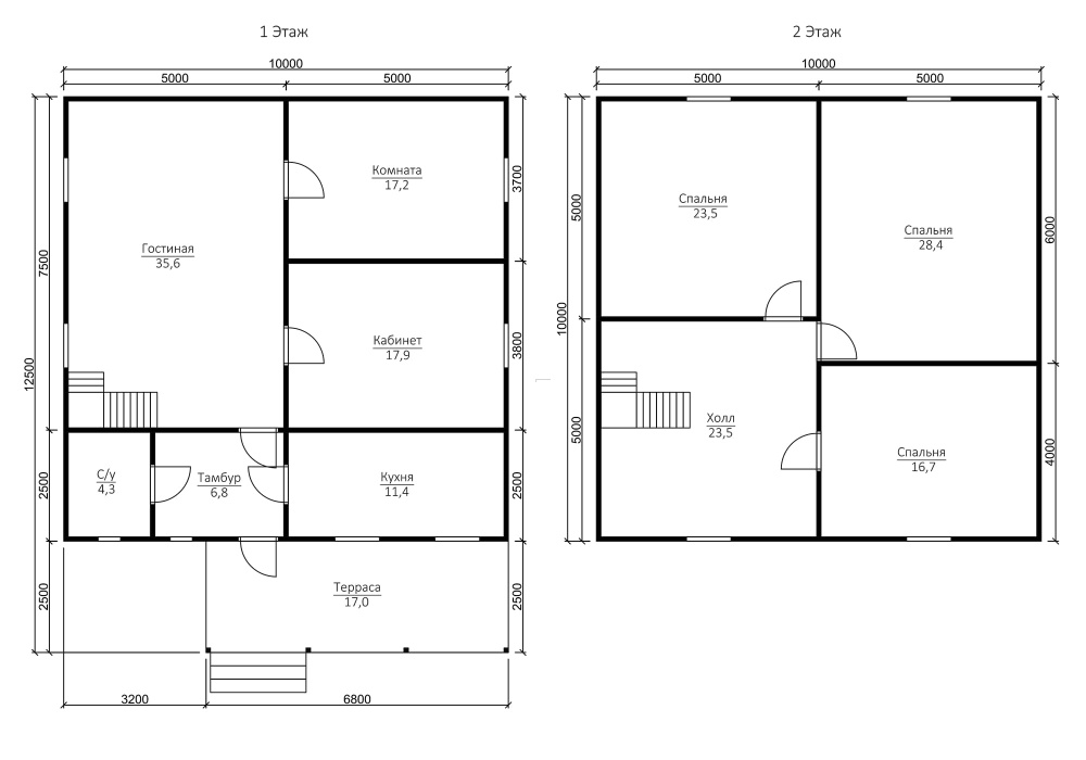 Сруб с мансардой: 1-ый этаж- 2,5 м. (18 венцов) 2-ой этаж (мансарда)- 2,4 м. Сруб в полтора и два этажа: 1-ый этаж 2,5 м ±4 см. (18 венцов) 2-ой этаж 2,5 м ±4 см. каркасные аттиковые стены (боковые) высотой 1,5 м. в полутораэтажном доме 2,5 м ±4 см (поднят брусом на 18 венцов) в двухэтажном доме. |